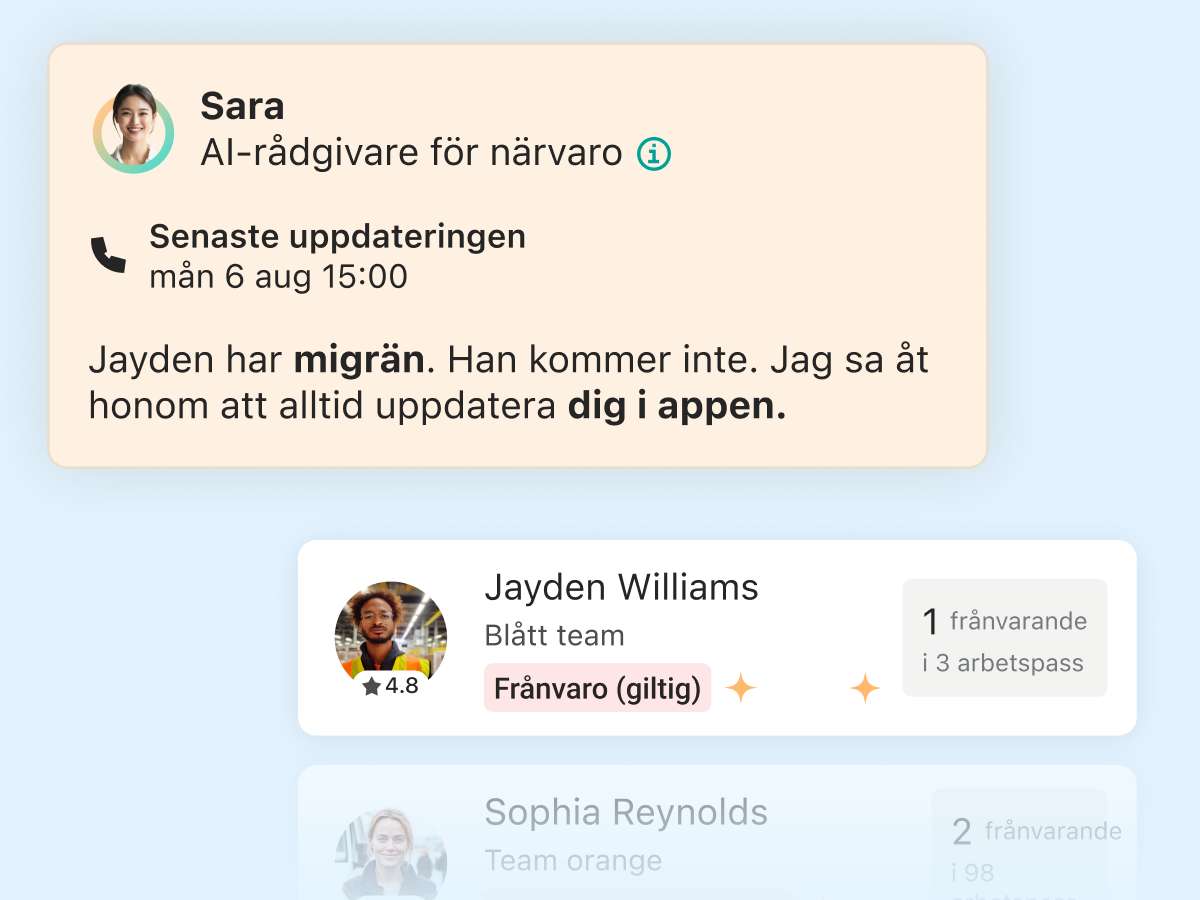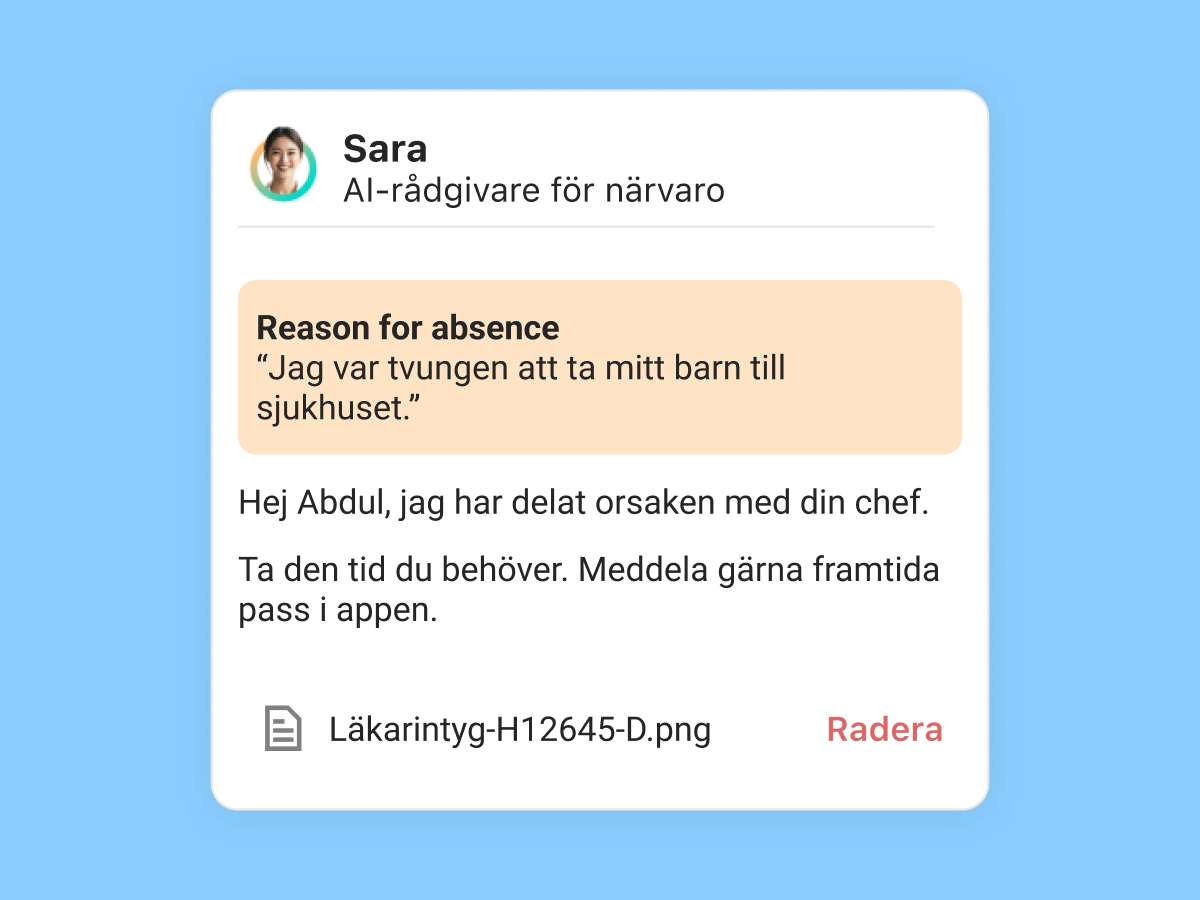 När en medarbetare missar sitt arbetspass följer hon omedelbart upp. Sara fångar upp orsaken, uppdaterar chefer och medarbetare, och förbättrar närvaron utan att röra ett finger.