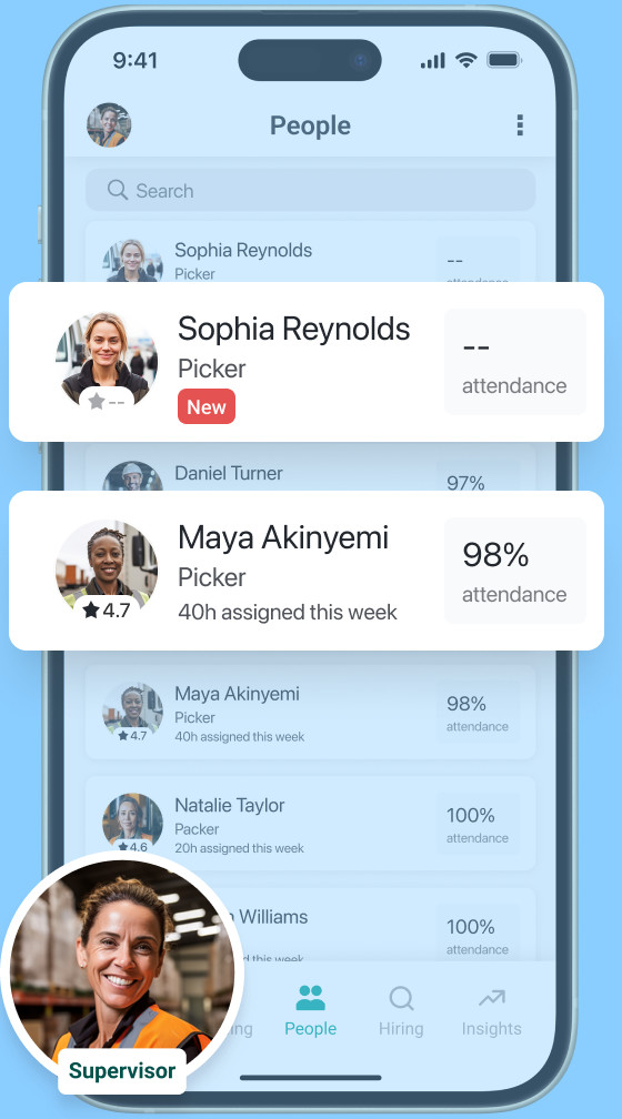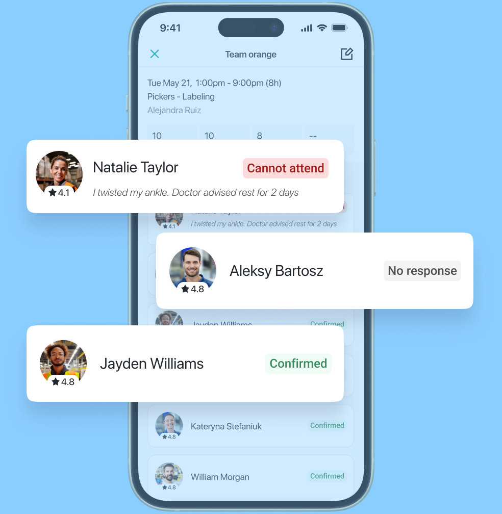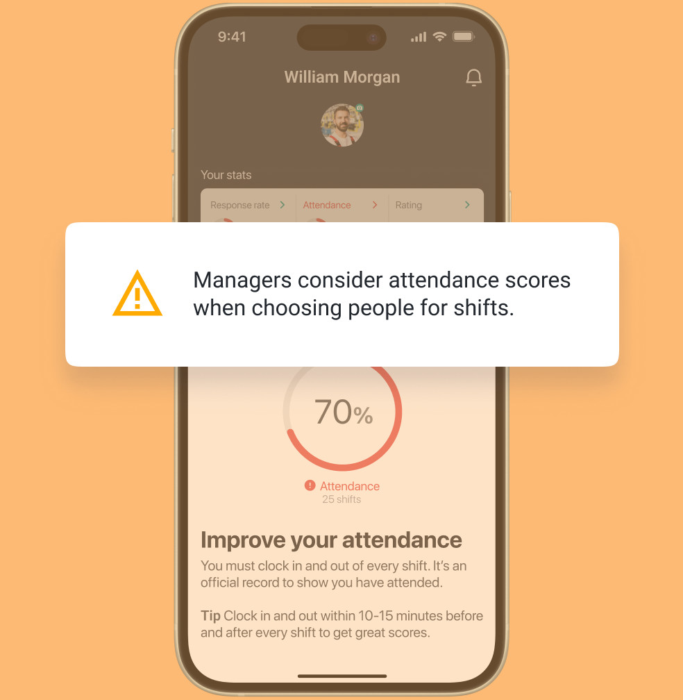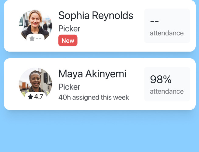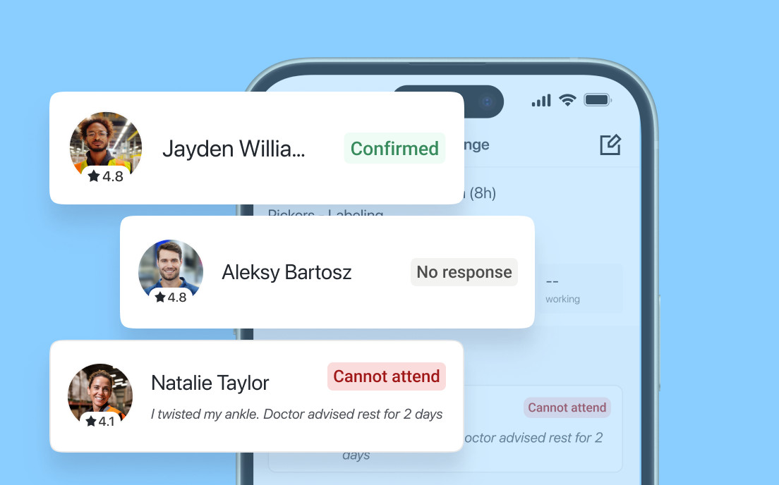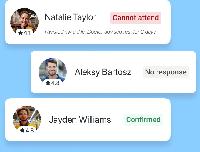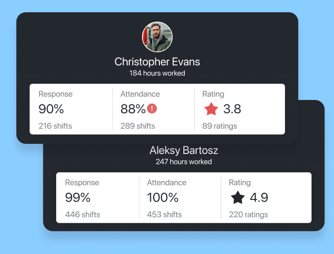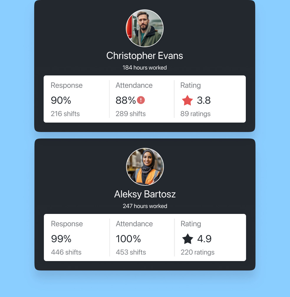 Job&Talent Business minskar frånvaro genom att använda data om medarbetarnas närvarohistorik, svarsfrekvens och prestationsbetyg. När du skapar skift kan du prioritera att tilldela pålitliga medarbetare med stark närvarohistorik. Detta proaktiva tillvägagångssätt hjälper till att minimera frånvaro och säkerställer en pålitlig arbetsstyrka.